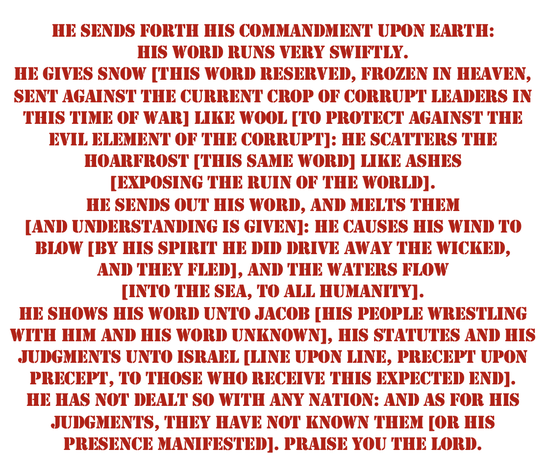6 This poor man [without worldly power] cried, and the LORD heard [shama’] him [heard his obedience, the product of their understanding], and saved him out of all his troubles [tsarah – tribulation]. [Romans 10:8 But what says it {Deuteronomy 30:14, speaking of how the LORD comes from heaven and is raised from death out of hell}? The word is near you, even in your mouth, and in your heart {from your mind revealed in your spoken thought}: that is, the word of faith {by which you are saved, and raised with Him}, which we preach; 9 That if you shall confess with your mouth the LORD Jesus, and shall believe in your heart {mind} that God has raised him from the dead, you shall be saved. 10 For with the heart {mind} man believes unto righteousness {correct, right, thinking}; and with the mouth confession is made unto salvation. 11 For the scripture says, Whosoever believes on him shall not be ashamed {not disappointed}.]