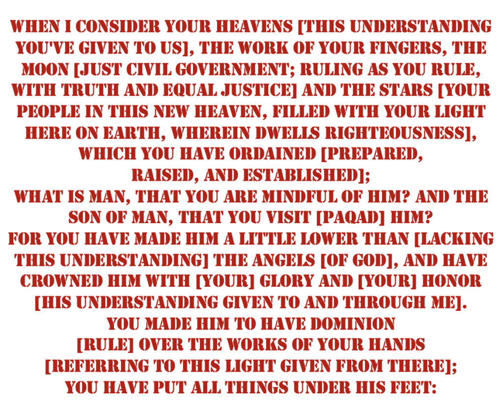 3 When I consider your heavens [this understanding You’ve given to us], the work of your fingers, the moon [just civil government; ruling as You rule, with truth and equal justice] and the stars [Your people in this new heaven, filled with Your light here on earth, wherein dwells righteousness], which you have ordained [kuwn – prepared, raised, and established];